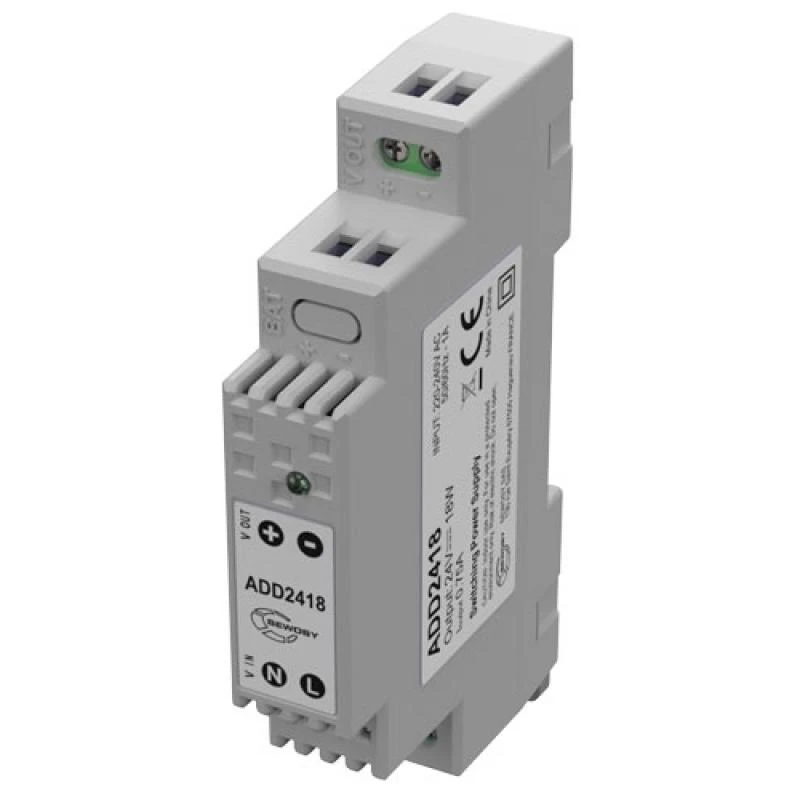 ADD2418 SEWOSY Alimentation Ă dĂ©coupage moduire Ă installer sur rail DIN et seulement de 1 module. Elle permet de transformer une tension d’entrĂ©e de 230V AC (de 220 Ă 240V) en 24V DC en sortie. Elle peut alimenter les ventouses, les bandeaux, les gĂąches Ă©lectriques et les lecteurs de proximitĂ© avec une intensitĂ© maximale de 0,75A / 18W. La nouveautĂ© de ce modĂšle : C’est un petit module qui s’adapte trĂšs facilement aux coffrets oĂč il ne reste que trĂšs peu de pce.