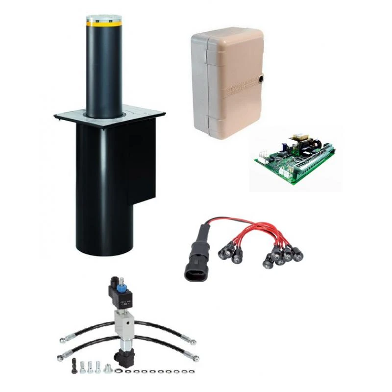 Caractéristiques spécifiques : Cylindre en acier Fe 360 (épaisseur 6 mm), Surface du cylindre gris foncé RAL 7021 métallisé (peinture à poudre de polyester), Tëte du cylindre en Aluminium RAL 9006, Alimentation de pompe hydraulique en 230 Vac et 50/60 Hz, 230 W d’absorption, Protection IP 56, Déverrouilge mécanique possible, poids de 90 kg, Autoportant, Longueur maximale de 50 m, 2 amplificateurs de boucles intégrés au coffret électronique.