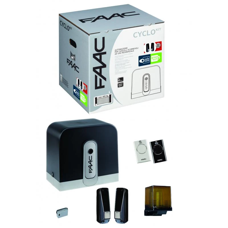 KIT CYCLO INTEGRAL 800 kg FAAC 24V Motorisation électromécanique à très haut rendement pour portail coulissant dans le cadre d’une utilisation résidentielle et pour du petit tertiaire, pour un poids alnt jusqu’à 800 kg. Une nouvelle électronique de gestion assure une meilleure sécurité anti-écrasement et d’évitement d’obstacle. L’ouverture est régble selon vos besoins du fait de son dispositif Maître/Escve et grâce à une batterie en option, vous aurez une entière autonomie en cas de panne de courant électrique.